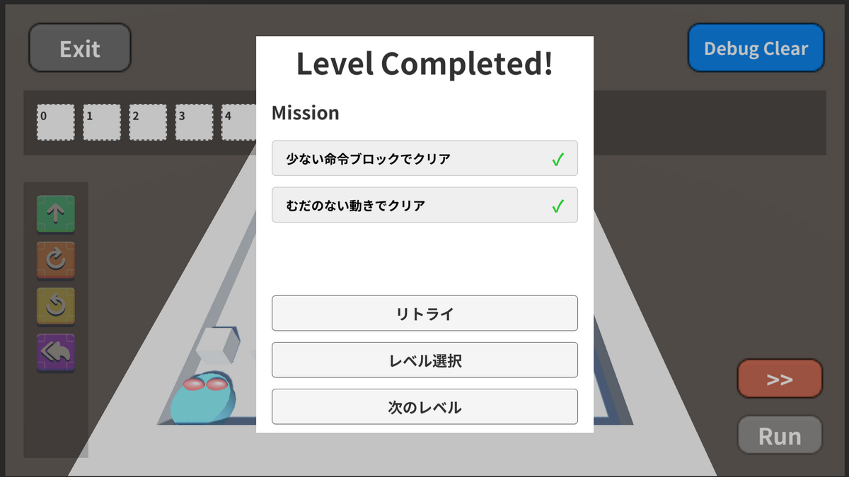 そこでプレイヤーは、いかに少ない命令でステージをクリアするかというチャレンジに挑戦することになります。